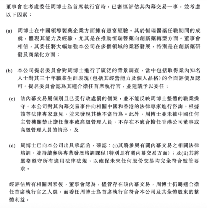 对于周云曙因内幕交易被罚一事,先声药业在公告中回应称,该内幕交易属个别且已受行政处罚的个案,并不能反映其整体职业操守,并披露了相关背景调查、法律专家咨询以及周云曙本人出具的法律培训承诺函。