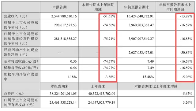 2025年前三季度,公司实现营业收入164.25亿元,同比下降13.87%;归母净利润39.60亿元,同比下降16.57%,营收和利润双双下滑,单三季度业绩更是出现明显暴跌。