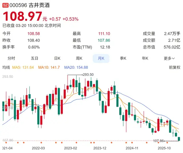 截至 2026 年 3 月 20 日收盘,古井贡酒股价108.97 元,市值576 亿元,近一年跌超 35%,对比历史高点293元已经腰斩,估值更是跌到历史低位。