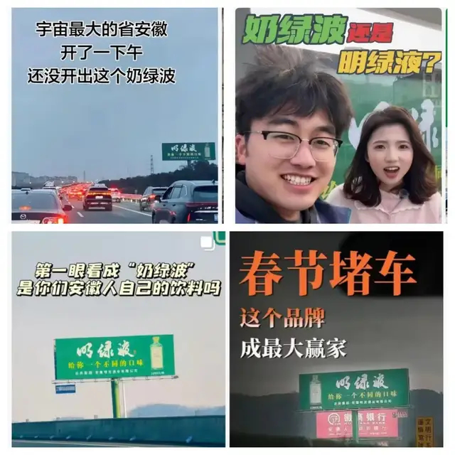 事情是这样的,今年春节期间,安徽高速堵车,不少司机百无聊赖中,把古井旗下明光酒业的“明绿液”广告牌误看成“奶绿波”,一句“开了一上午还没走出奶绿波”迅速在社交平台发酵,相关话题播放量轻松破亿。