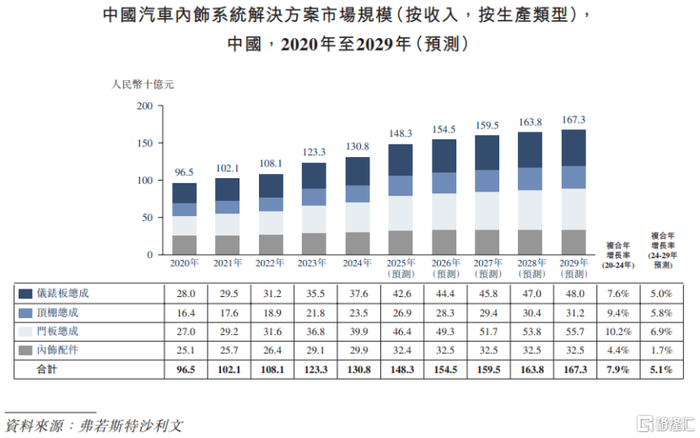 受益于汽车智能化的持续渗透、个性化定制的兴起以及绿色轻量化材料的应用,预计2029年汽车内饰系统解决方案市场将达到1673亿元,2024年至2029年的复合年增长率为5.1%。