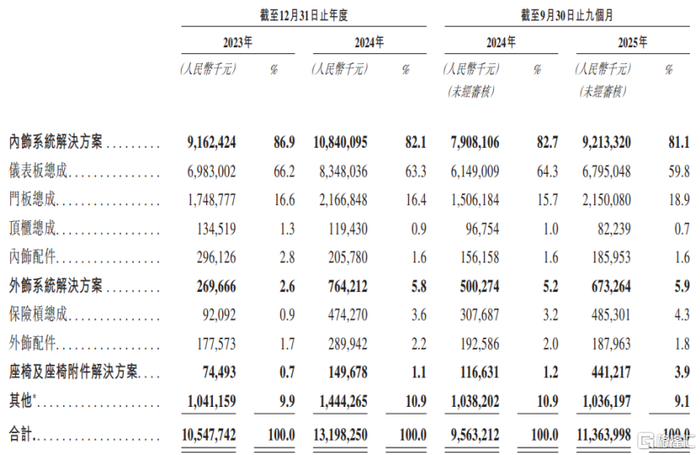 具体来看,2023年、2024年、2025年1-9月(简称“报告期”),新泉股份超过80%的收入来自内饰系统解决方案,其中,仪表板总成贡献了约60%的收入,门板总成的收入占比在16%左右。