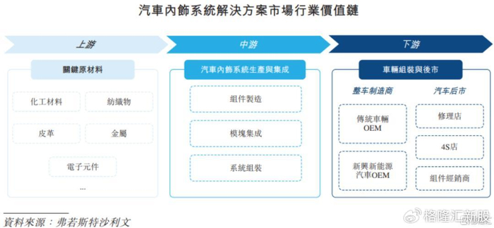 汽车内饰产业链上游主要为原材料供应,包括化工材料、纺织物、皮革及电子元件,作为制造内饰部件的基材及填充物。
