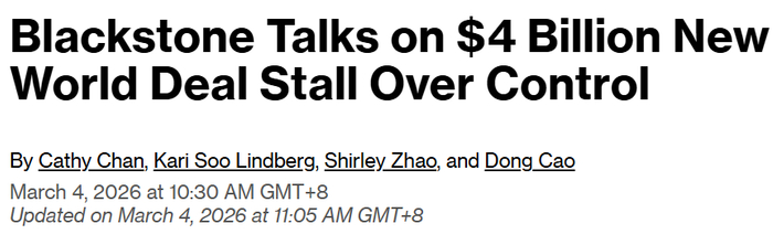 3月4日,彭博社援引知情人士消息称,黑石集团与新世界发展(00017.HK)之间的注资谈判遇阻,核心分歧在于控制权安排。
