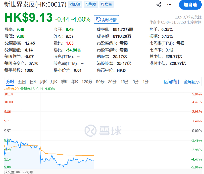 消息传出后,新世界股价承压,今天上午低开0.84%,盘中最低见9港元,最新报9.13港元,跌幅4.60%。