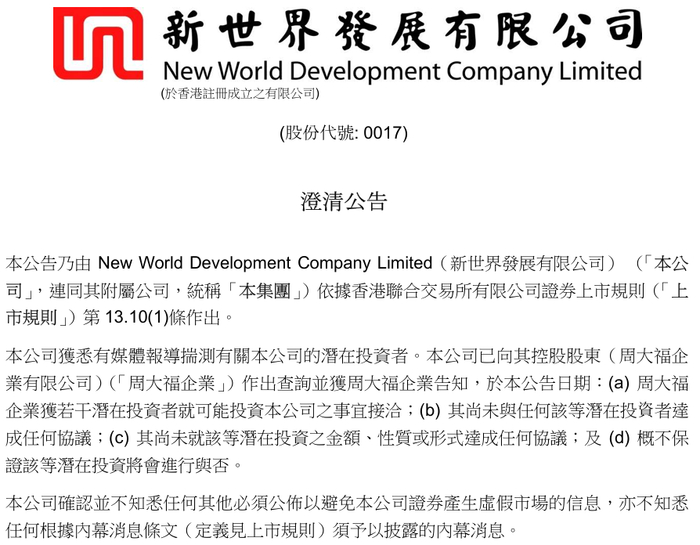 新世界随后公告确认,其控股股东周大福企业已与投资者就可能投资事宜展开商讨。