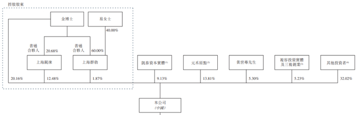 金博士直接持股20.16%,其与配偶易女士通过上海锐徕、上海群勃分别持股12.48%、1.87%,合计持股34.50%;