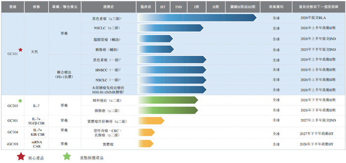公司的研发策略为「渐进式突破性创新」,旨在提高开发效率与整体成功率。GC101最初基于DeepTILTM平台开发,临床验证后,在GC101基础上利用NovaGMPTM平台进行单基因修饰开发GC203,增强抗肿瘤活性。在GC203临床验证后,以GC203为基础开发双基因修饰的GC301和GC304,针对性解决肿瘤免疫治疗的难点与痛点。