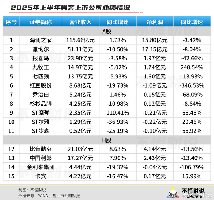 粗略统计出15家以男装销售为主营的上市公司,2025年上半年,除海澜之家外,仅ST摩登、乔治白、中国利郎、比音勒芬实现营收增长,其中ST摩登尚处在亏损状态,乔治白、中国利郎、比音勒芬则与海澜之家一样同样呈现“增收不增利”的状态。