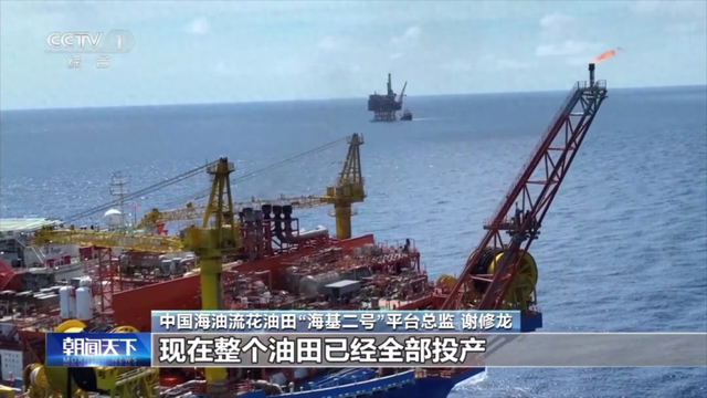 中国海油流花油田“海基二号”平台总监 谢修龙:原油在“海基二号”平台经过初步处理后,输送到2.5公里外的海上油气加工厂“海葵一号”做进一步加工和储存。截至目前,我们已经累计向陆地炼油厂输送了25船次的原油。现在油田已全面投产,开发效果好于预期,日产量创下了我们油田22年来的新高。