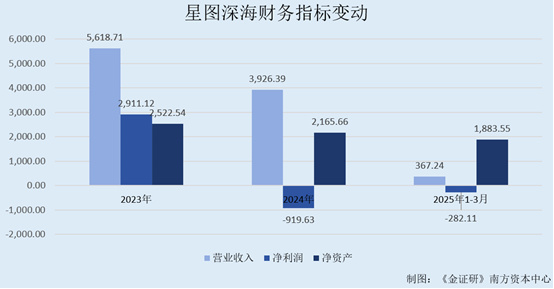 时间来到2024年。据股权出售公告,2024年,星图深海的营业收入为3,926.39万元,净利润为-919.63万元,净资产为2,165.66万元。2025年1-3月,星图深海的营业收入为367.24万元,净利润为-282.11万元,净资产为1,883.55万元。
