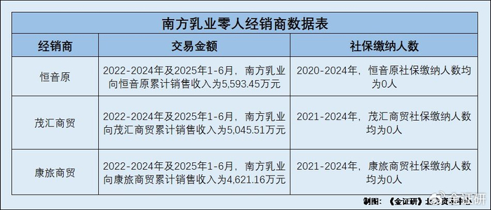 此外,南方乳业三家主要经销商,2022-2024年及2025年1-6月合计交易金额均超四千万元,累计金额超亿元。研究发现,2022-2024年,前述三家经销商社保缴纳人数均为零人,交易真实性或值得关注。