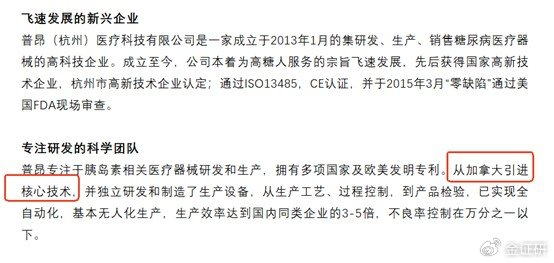 据认证主体为普昂医疗的微信公众平台“普昂Promisemed”于2019年5月7日发布的内容,普昂医疗成立于2013年,专注于胰岛素相关医疗器械研发和生产,拥有多项国家及欧美发明专利,从加拿大引进核心技术,并独立研发和制造了生产设备。