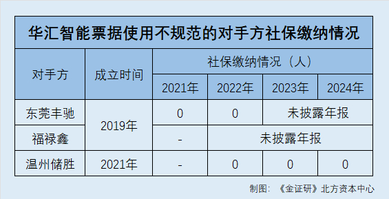 另一方面,2021年,华汇智能曾存在大票换小票、向非金融机构票据贴现以及购买票据的不规范行为,累计发生的金额超两千万元且占当年营收的比例超九成。除此之外,前述不规范票据的对手方中,一家企业在2021年社保人数为0人,另一家企业则成立当年存在与华汇智能进行换票以及贴现行为。