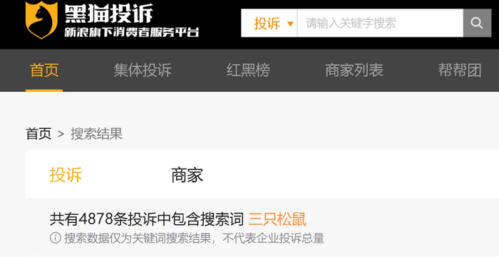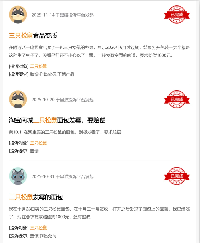 在黑猫投诉[下载黑猫投诉客户端]平台,三只松鼠的投诉词条近5000条,不少消费者都反映食品有异物、发霉等问题。