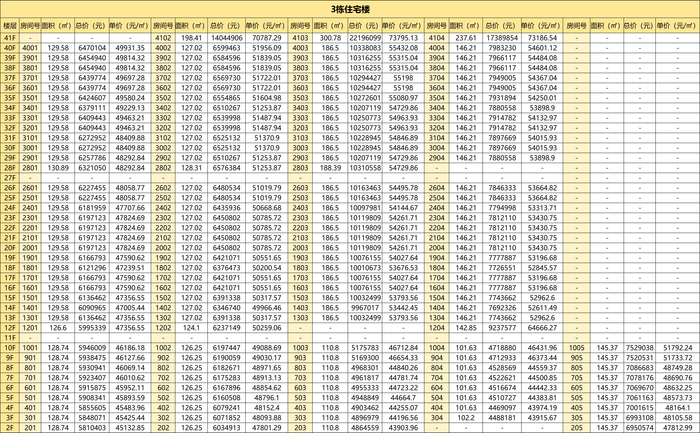 最贵的一套为顶层4103房,建面约300.78㎡,总价2219.61万元,单价7.38万元/㎡。