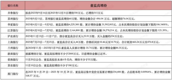 厦门银行董监高在2025年4月29日—2025年10月28日,累计增持25.44万股,累计增持金额168.57万元;兰州银行董监高,为稳定股价,在2024年11月—2025年5月19日,累计增持 35.74万股,累计增持金额84.35万元。