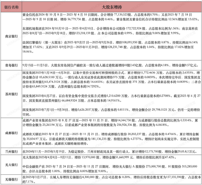 除上述三家城商行外,还有成都银行、兰州银行和无锡银行皆获大股东增持。