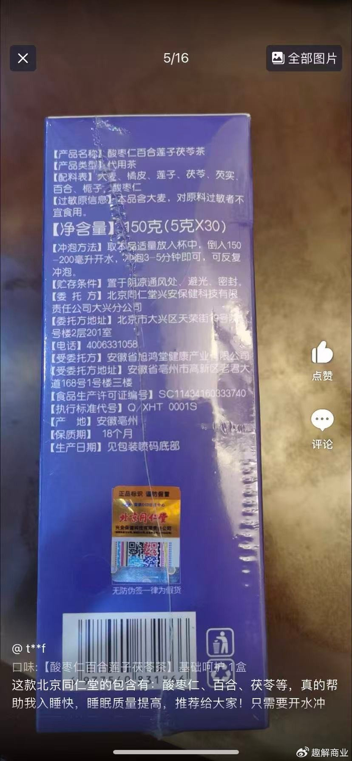 电商平台上非北京同仁堂官方旗舰店中售卖的一款名为“酸枣仁百合莲子茯苓茶”的商品上标有“北京同仁堂兴安保健科技有限责任公司”的字样,但“北京同仁堂”的字体相较“兴安保健科技有限责任公司”放大多倍。通过消费者晒图能看出,该产品的委托商为北京同仁堂兴安保健,受委托方为安徽省旭鸿堂健康产业有限公司。