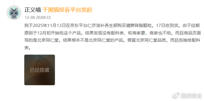 黑猫投诉[下载黑猫投诉客户端]平台上,多位消费者投诉,买到的产品货不对板,到手后发现不是北京同仁堂的产品。社交平台上,也有网友吐槽北京同仁堂兴安保健和北京同仁堂(四川)药业的产品质量较差,效果不好。