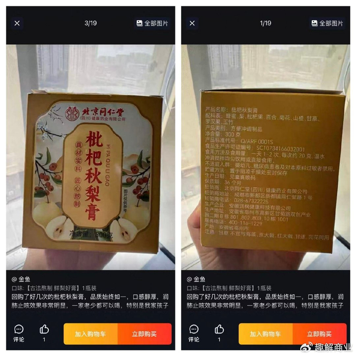 电商平台上非北京同仁堂官方旗舰店中售卖的一款名为“枇杷秋梨膏”的产品,包装上标有“北京同仁堂(四川)健康药业有限公司”的字样,与上述的“酸枣仁百合莲子茯苓茶”一样,“北京同仁堂”的字体同样放大几倍。而通过消费者晒图能看出,该产品的经销商为北京同仁堂(四川)药业,生产企业为安徽润枫健康科技有限公司,生产地址同样为安徽亳州。