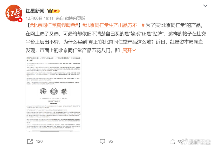 据“红星资本局”报道,如今市面上的北京同仁堂产品五花八门,即便是同一种产品,也可能有不同的生产厂家和出品方。在经销商层面,有自称招商人员的人士出示了由北京同仁堂兴安保健科技有限责任公司(下称“北京同仁堂兴安保健”)等公司出具的授权书,甚至称“网上买到的基本上都是贴牌”。