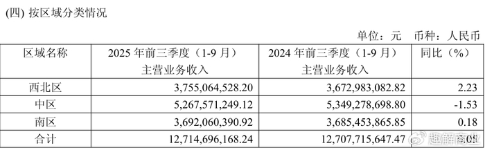 按区域分类,重庆啤酒共有西北区、中区、南区三大区,2025年前三季度,重庆啤酒中区市场营收同比下滑1.53%,在三大市场中下滑最为严重。