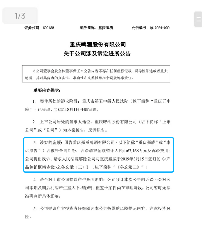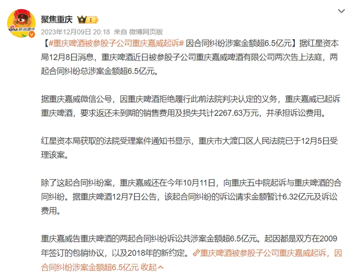 2020年9月,重庆嘉威将重庆啤酒告上法庭,认为重庆啤酒违反《包销协议》约定的相关义务,对重庆啤酒等7家被告单位的索赔金额为6.39亿元,这一索赔标的后来增加至8.22亿元。