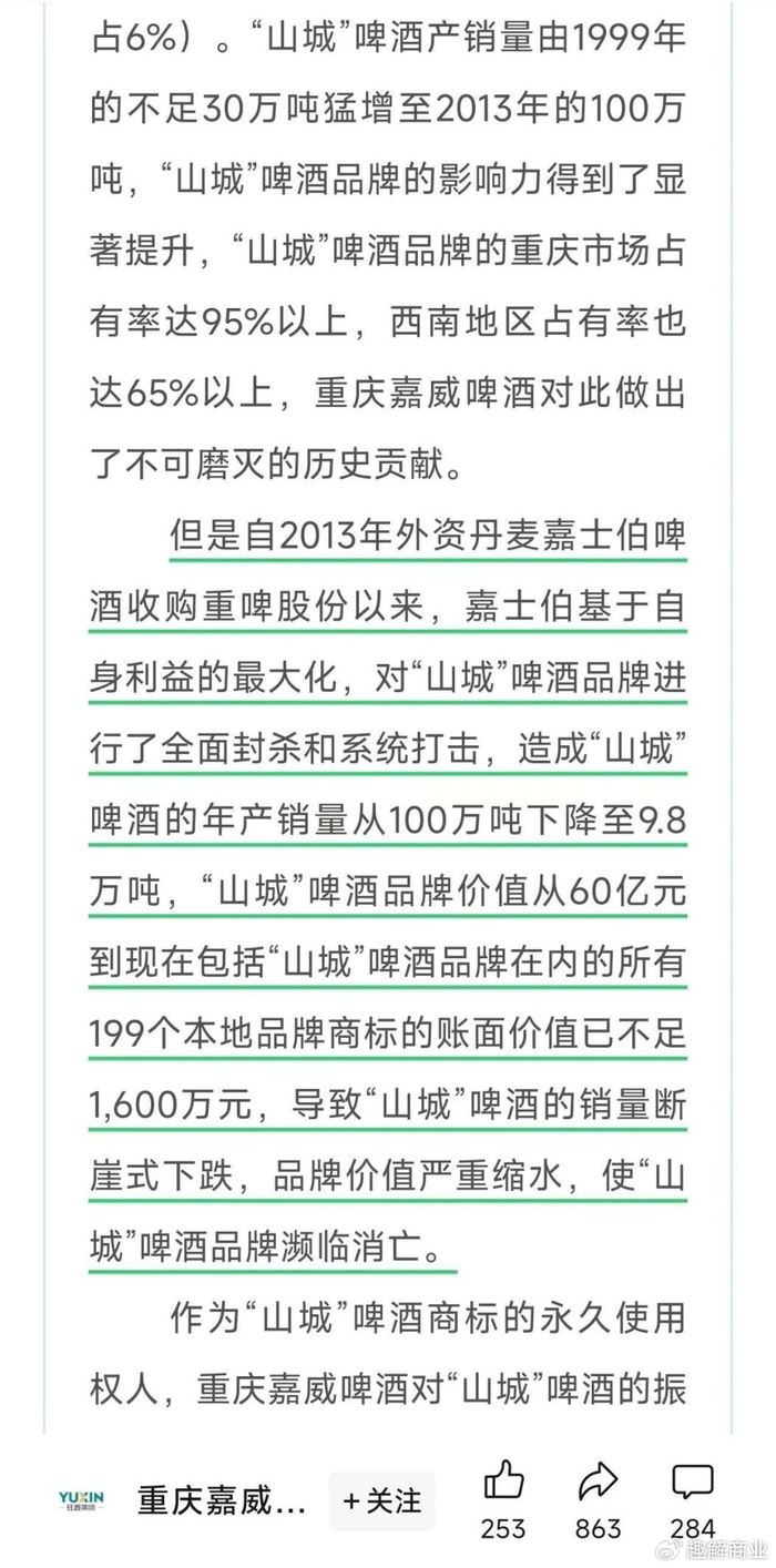 案件审理期间,2024年6月14日,重庆嘉威发布《关于捍卫“山城”民族品牌,声讨嘉士伯与重啤股份恶意扼杀、消亡“山城”品牌的严正函告》,同年8月2日,重庆嘉威又发布了《重庆嘉威啤酒有限公司关于拯救“山城”啤酒品牌的声明》,并在声明中强调“以救‘山城’啤酒于危难之际,以免‘山城’啤酒重蹈天府可乐的覆辙”。