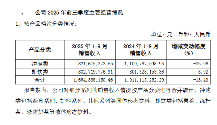 据香飘飘2025年10月30日发布的《2025 年前三季度经营数据公告》看,2025年前三季度,即饮业务虽实现销售收入8.33亿元,同比增长3.92%,且销售收入占比首次超过冲泡业务,但3.92%的增速过于缓慢,难以弥补冲泡业务下滑带来的缺口。