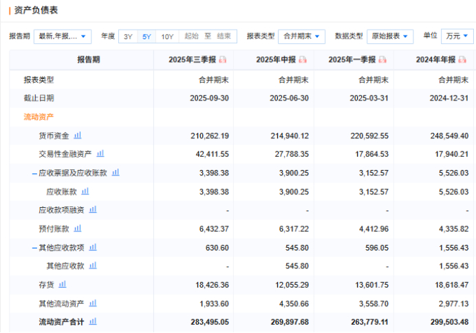 在手现金的持续缩水,进一步加剧了香飘飘的财务压力。从资产负债表数据来看,2024年末,香飘飘流动资产合计29.95亿元,到2025年9月底,流动资产合计降至28.35亿元,9个月内减少1.6亿元;资产合计从2024年末的48.73亿元,降至2025年9月底的47.23亿元,资产规模持续收缩。