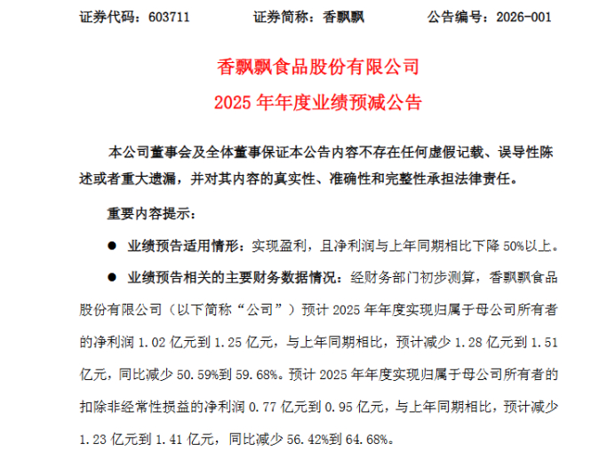 香飘飘2025年的业绩预告,堪称其上市以来最惨淡的成绩单之一。公告显示,公司预计2025年度实现归母净利润1.02亿元至1.25亿元,同比减少50.59%至59.68%;扣非归母净利润为0.77亿元至0.95亿元,同比降幅更是扩大至56.42%至64.68%。营收方面,预计2025年实现营收约29.27亿元,同比减少10.95%。