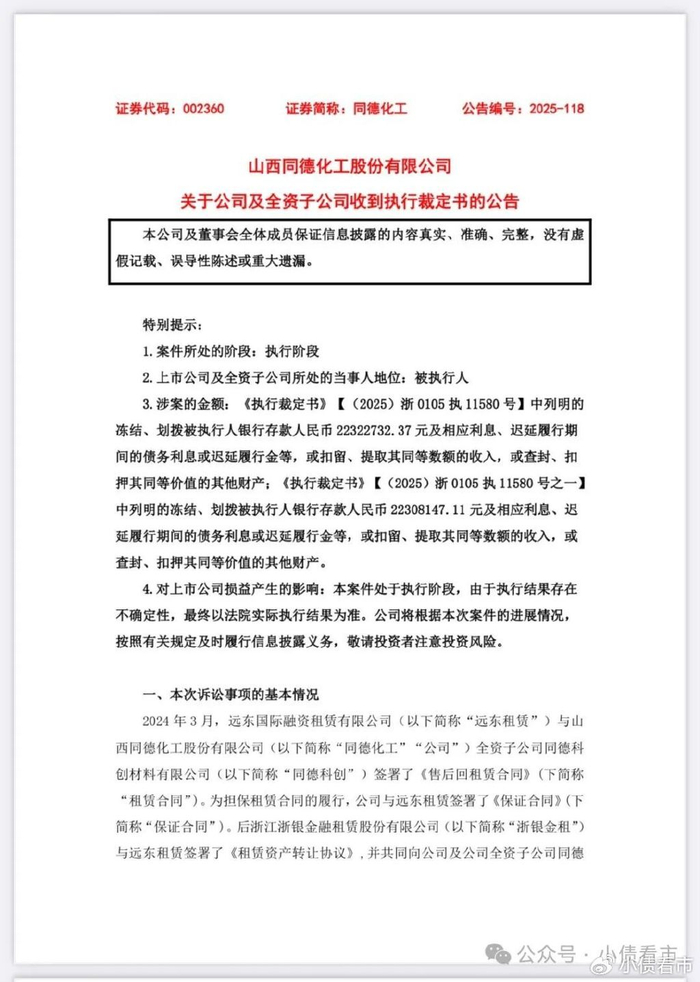 截至2025年10月16日,同德化工和子公司在融资租赁公司等金融机构的逾期债务本金超2亿元,占公司2024年经审计净资产的10.21%。