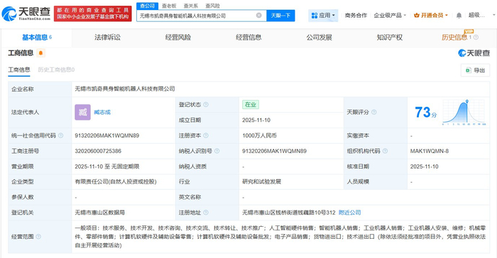 雷达财经讯,天眼查App显示,近日,无锡市凯奇具身智能机器人科技有限公司成立,法定代表人为臧志成,注册资本1000万人民币,经营范围包括人工智能硬件销售、智能机器人销售、工业机器人销售、计算机软硬件及辅助设备零售等。股东信息显示,该公司由凯龙高科(300912)、湖北启灵机器人有限公司等共同持股。