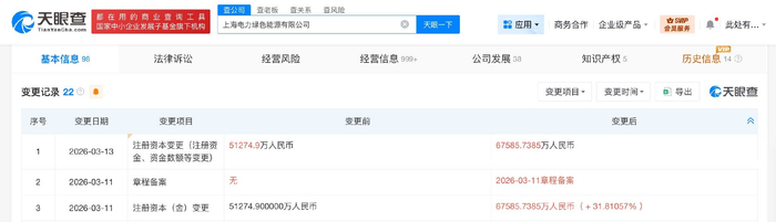 雷达财经讯,天眼查工商信息显示,近日,上海电力绿色能源有限公司发生工商变更,注册资本由约5.1亿人民币增至约6.8亿人民币,增幅约32%。