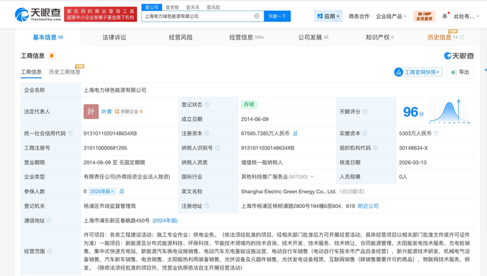 该公司成立于2014年6月,法定代表人为叶青,经营范围包括新能源及分布式能源科技、环保科技、节能技术领域内的技术咨询、技术开发、技术服务、技术转让,太阳能发电技术服务等。股东信息显示,该公司由上海电力(600021)全资持股。