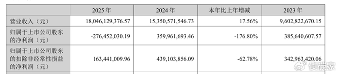 3月19日,帝科股份发布2025年年度报告,全年实现营业收入180.46亿元,同比增长17.56%,归母净利润亏损-2.76亿元,为三年来首亏,扣非净利润1.63亿元,同比下降62.78%。