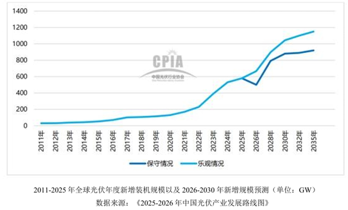 据帝科股份年报披露,2025年中国光伏发电新增装机315.07GW,同比增长超13%,中国光伏行业协会预计,2026年,预计国内新增装机量相较2025年有所回调。不过,2027年起预计国内新增装机逐渐增加,到2030年预计达 270~320GW。另据多家机构统计预测,2025年全球光伏发电新增装机规模同比增长6%-14%之间,基本符合国内增长趋势。