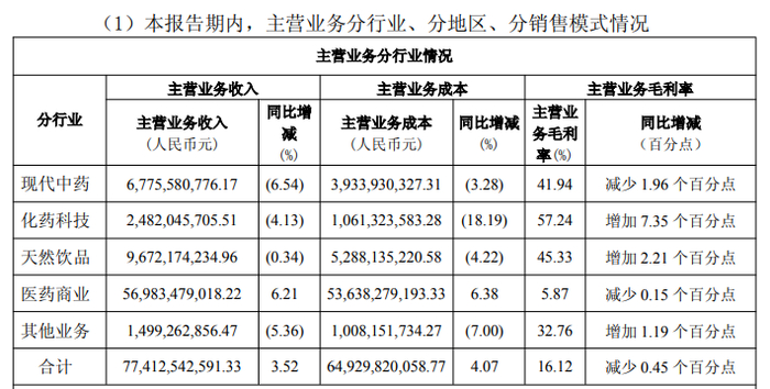 现代中药、化药科技、天然饮品、其他业务这四大业务板块分别实现收入67.76亿元、24.82亿元、96.72亿元、14.99亿元,分别同比下降6.54%、4.13%、0.34%、5.36%。
