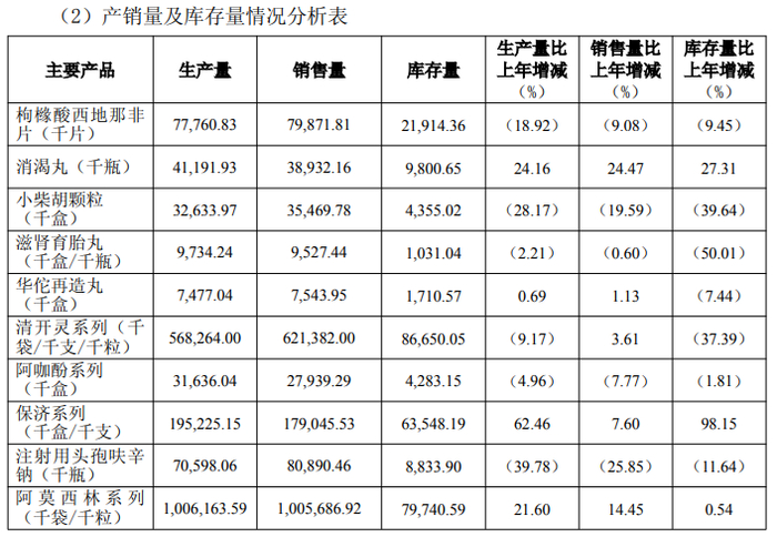 值得一提的是,白云山在财报中列举的十款主要产品中,枸橼酸西地那非片、小柴胡颗粒、滋肾育胎丸、阿咖酚系列、注射用头孢呋辛钠这五款产品2025年销量均出现下滑,其中小柴胡颗粒、注射用头孢呋辛钠销量均出现两位数下滑,分别下滑19.59%、25.85%。