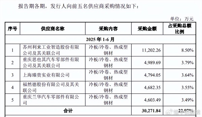重庆思也其汽车零部件成立次年晋升为前五供应商。报告期内,重庆思也其汽车零部件有限公司(重庆思也其汽车零部件)均位列至信股份前五供应商之列,采购金额分别为5,913.99万元、8,466.25万元、8,673.55万元、4,989.69万元,采购内容是冷板/冷卷、热成型钢材。
