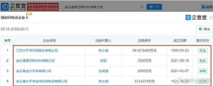 需要指出的是,连云港黑石的联系电话(0518-83062813)与石英股份、连云港金沙石英有限公司(连云港金沙)、连云港太平洋金浩石英制品有限公司(石英股份子公司)相同,为何3家企业共同使用同一个联系号码?