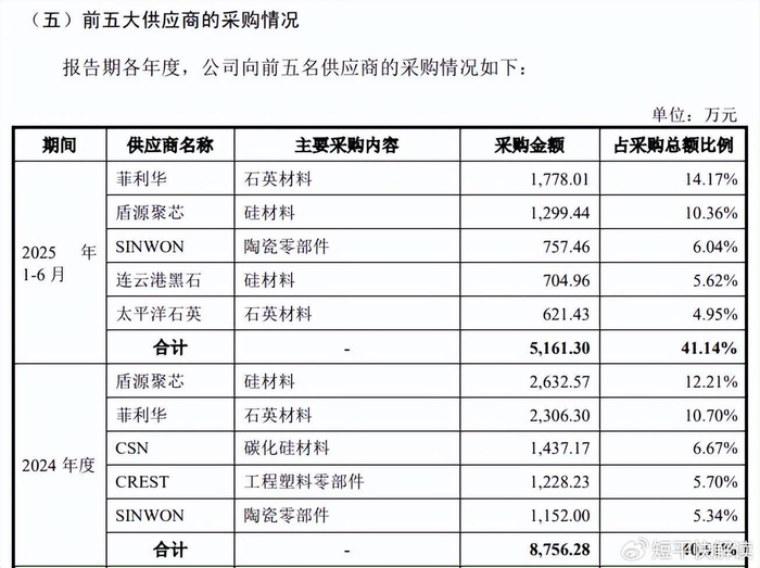 两大供应商为何共用同一联系方式?报告期内,臻宝科技前五大供应商变动较大,2025年1-6月新增连云港黑石新材料有限公司(连云港黑石)、太平洋石英两大供应商,采购额分别为704.96万元、621.43万元,采购内容分别为硅材料、石英材料。