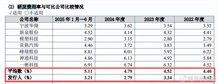 对比来看,可比同行研发费用率均值均超过公司,分别为4.4%、4.52%、4.79%、5.11%,2024年,宁波华翔、新泉股份、模塑科技、常熟汽饰、峰璟股份、神通科技、一彬科技研发费用率分别为3.62%、4.14%、3.15%、3.72%、6.01%、6.13%、6.74%,公司研发费用率在同行中垫底,2025年1-6月,仅模塑科技落后于公司,其余同行仍然远超公司,显然研发投入仍需要进一步加强。