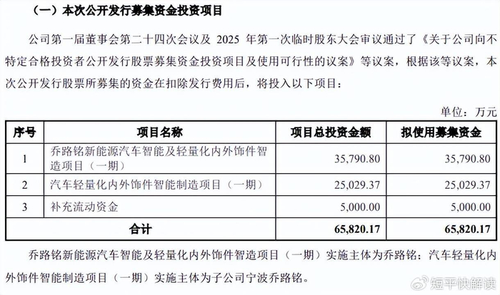 据短平快解读了解,本次IPO,乔路铭拟公开发行不超过5000万股(未考虑超额配售选择权),拟募集资金6.58亿元,用于乔路铭新能源汽车智能及轻量化内外饰件智造项目(一期)、汽车轻量化内外饰件智能制造项目(一期)以及补充流动资金,拟使用募集资金分别为3.58亿元、2.5亿元、0.5亿元。