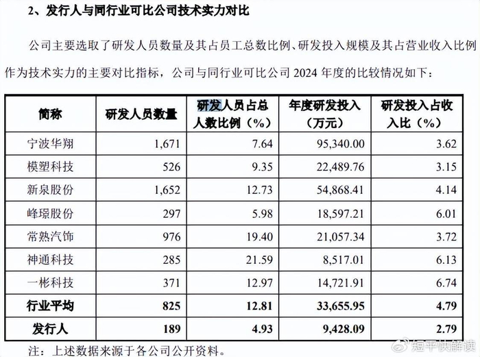 进一步来看,公司研发费用投入、研发人员规模在同行中并不占据优势,2024年分别为9428.09万元、189人,而宁波华翔、模塑科技、新泉股份、峰璟股份、常熟汽饰、神通科技、一彬科技研发费用分别为95,340.00万元、22,489.76万元、54,868.41万元、18,597.21万元、21,057.34万元、8,517.01万元、14,721.91万元,而研发人员分别为1671人、526人、1652人、297人、976人、285人、371人,均超过公司。