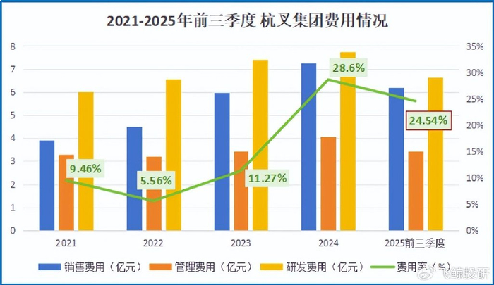 2024年,杭叉集团的期间费用率一度增至28.6%。但公司迅速调整,到了2025年前三季度已经回落至24.5%,该报告期内,若再去除研发费用,公司另外两项费用率合计仅为14.5%。