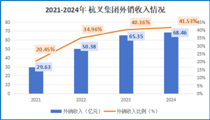近4年来,公司的外销收入增长迅速。外销收入从2021年的29.63亿元增长至2024年的68.46亿元,大增131.05%。