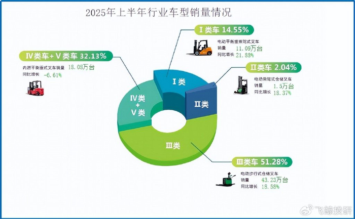 2025年上半年,我国电动平衡重式叉车销量同比增长超20%,电动仓储叉车也增长超过18%,而传统内燃叉车却同比下滑了6.61%,几乎停滞。