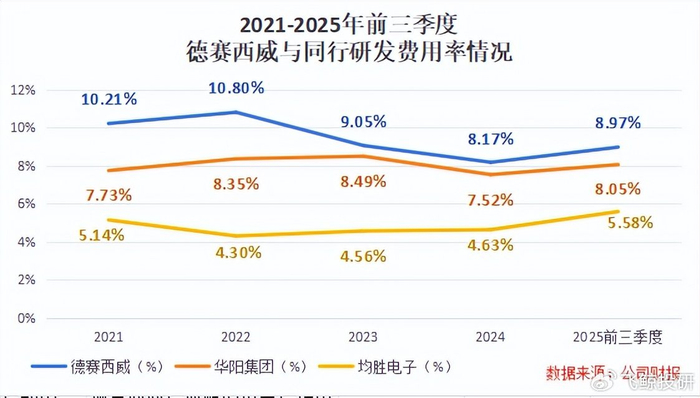2021-2024年,德赛西威的全年研发费用从9.77亿元增至22.56亿元,研发费用率一直保持在10%左右的高水平,远超同行华阳集团(7%左右)、均胜电子(5%左右)等。
